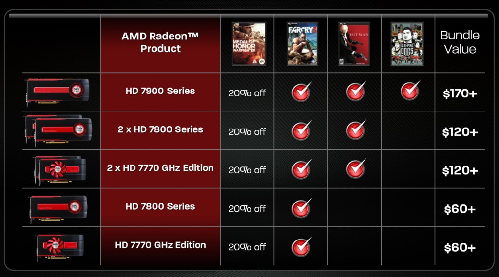 Buy any latest Radeon HD video card from the 7770 GHz and up and you will receive free download codes for games that you genuinely want to play. Far Cry 3 on basic cards, and three-game deals that supply Far Cry 3, Hitman: Absolution and Sleeping Dogs for buying the 7900 series. There’s also a good discount on Medal of Honor: Warfighter and promises of bundles with 2013’s BioShock Infinite and, my personal most anticipated game of 2013, the new reimagining of Tomb Raider. Definitely one of these cards will hold the interest of those of you wanting to jump start a game collection.