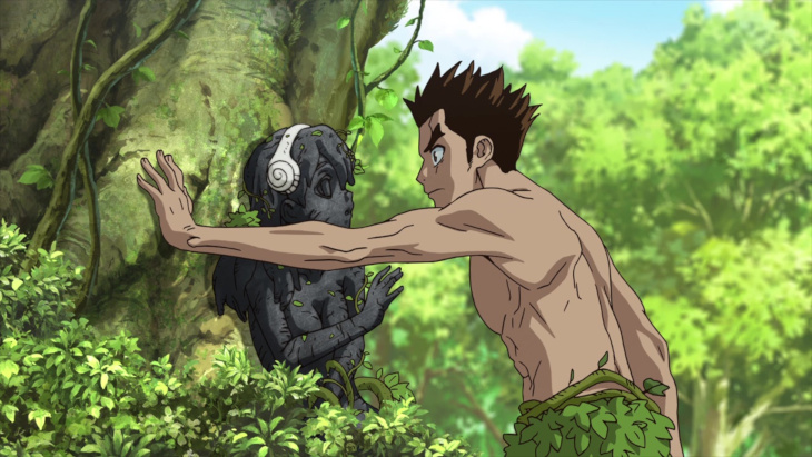 The story is set in the year 5738 (I suppose it is 5739 by the end of the first episode). More than 3700 years prior humanity was abruptly afflicted with a condition that turned humans to stone. After millennia trapped in his stone prison, high school student Taiju wakes to find a landscape reclaimed by nature. He quickly rediscovers the girl he had a crush on still petrified under the tree, now grown to massive proportions, where he had last seen her. With her he finds a message from his friend, Senku, who he soon learns had woken months prior and had been preparing the means to survive and potentially restore humanity. This issue I have with our two primary characters in this story is that they exist in extremes. Taiju is a particularly extreme version of the muscle-bound idiot with a heart of gold stereotype, and Senku is such an extreme level of genius that he knows exactly what date it is because he counted every second he was petrified. That’s a level of ridiculous that just irritates me. Fortunately, those extremes do balance each other out a little, and I find them less annoying when their working off of one another. Still, I’d like to see their personalities turned down from 11.