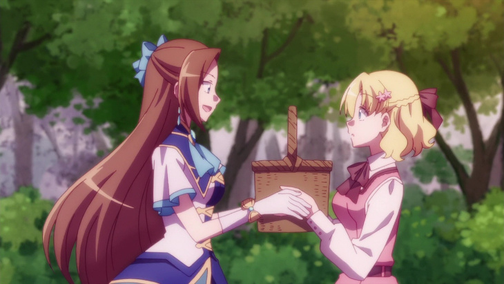 The rest of the cast is as charming and varied as one might hope. It consists of the various romantic interests from the game, which includes Geordo, the prince whom Catarina was with when she was injured, Geordo’s brother, her adopted brother and a soft-spoken but charming upperclassman. On top of that, we also have the original protagonist from Fortune Lover and two of the other potential romantic rivals from the game, a shy albino reading-enthusiast who is the younger sister of the aforementioned upperclassman and a gardening enthusiast who is the fiance of Geordo’s brother. Watching the characters politely spar in the background over Catarina’s affections while she remains completely unaware is another of the show’s recurring gags. I’d love to go in depth with each of the characters, but, as one might guess from glancing at that listing, there just isn’t enough time, and such a discussion is bound to meander. I will say that my favorite of the romantic interests was probably Maria, the game’s proper protagonist, as her interactions with Catarina were a lot of fun, and watching Catarina blindly stumble into romantic events and only realize afterwards they were events from the game is always worth a few laughs.